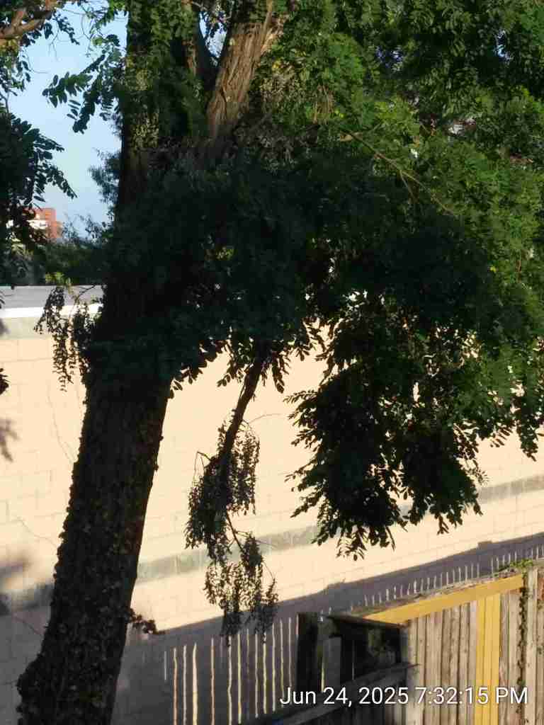 The tree has several broken and dead limbs. There is a broken limb hanging straight down; it has been that way for a long time. I don’t know why it has not fallen off. Anyone passing by when it falls down could suffer serious personal injury.